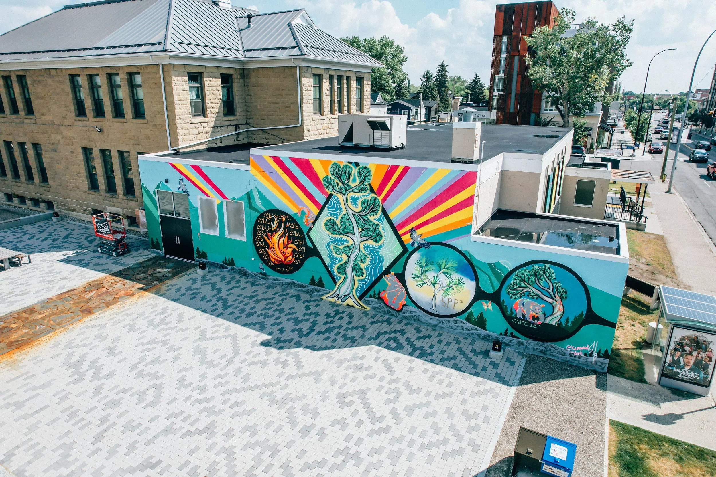 This mural was installed on the west wall of the Alexandra Dance Hall. The mural was created by artist, Mackenzie Brown, under the Beltline Urban Mural Project initiative. This Parks Canada mural celebrates and encourages the preservation of white bark pine trees in our national parks.